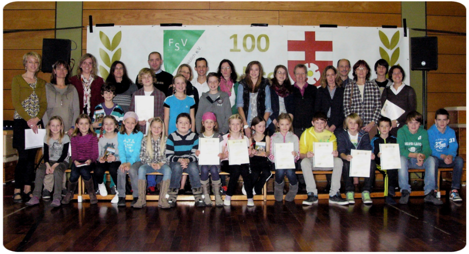 Nun sind bereits wieder 5 Jahre seit dem 100-jährigen Vereinsjubiläum des FSV Dieblich vergangen. Sie erinnern sich doch sicher noch: Damals war es unser Ziel, mindestens 100 Sportabzeichen im FSV Dieblich zu erreichen. Dieses Ziel wurde locker geschafft. Wesentlich mit dazu beigetragen haben auch 14 Familien (siehe anhängendes Foto), die das Familiensportabzeichen errangen. Sie waren damals auch mit von der Partie.