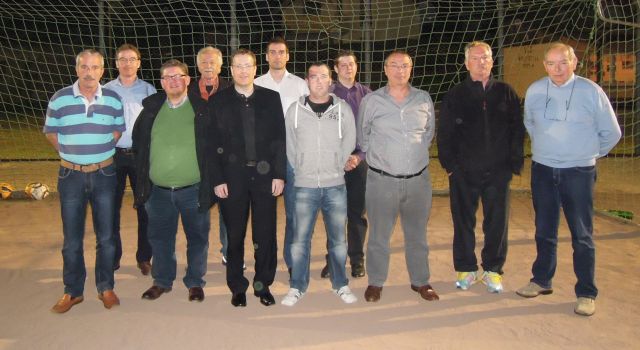 Foto: Die Vorstände des FSV Dieblich und des VfR Niederfell nach der Vertragsunterzeichnung zur Gründung der SG Dieblich/Niederfell im Seniorenfußball (Von links: Bodo Wild (N), Georg Christ, Manfred Eckhardt, Johannes Arenz, Jens Konieczny (alle D), Dominik Schmitz (N), Christian Schäfer (D), Manuel Herbert, Erwin Basche (beide N), Frank Dirschus-Gaumert (D), Wilfried Meidt (N)).