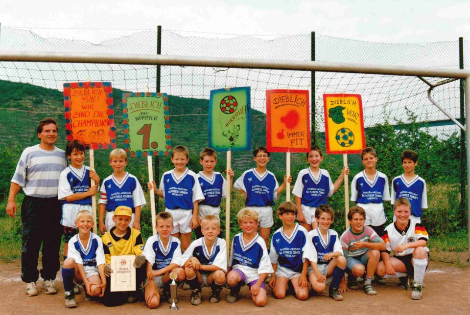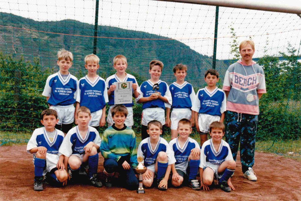Foto: Die Fußball-E-Jugend der JSG Dieblich/Niederfell wurde mit 68:7 Toren und 28:4 Punkten Staffelsieger, ferner Kreispokalsieger und Vizekreismeister. Peter Bicker wurde Torschützenkönig mit 52 erzielten Toren (stehend: Reinhold Arens (Trainer und Betreuer)*, Peter Bicker*, Christoph Schwank, Mike Spohn*, Jörg Sackenheim*, Klaus Wisbar*, Jörg Fries*, Michael Metz*, Frank Barth, Helmut Schwarz (Trainer und Betreuer), kniend: Jürgen Weber, Martin Bernst*, Dirk Nöthen, Lothar Gräf, Andreas Knauf, Ralf Jung*, Thomas Vogt*, Markus Künne; *=FSV-Mitglieder