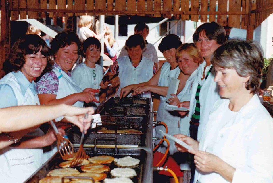 Foto: Fleißige Vereinsmitglieder beim Backen der Krebbelcher (Christa Bleise, Resi Bierbrauer, Karin Escher (Kirchstr.), Gertrud Ecker, Christel Pistono, Fränzi Niehl, Helma Rullmann, Ursula König)